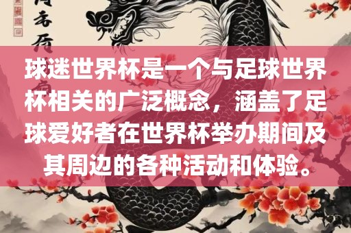 球迷世界杯是一个与足球世界杯相关的广泛概念,涵盖了足球爱好者在世界杯举办期间及其周边的各种活动和体验。