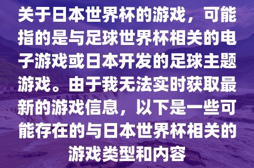 关于日本世界杯的游戏,可能指的是与足球世界杯相关的电子游戏或日本开发的足球主题游戏。由于我无法实时获取最新的游戏信息,以下是一些可能存在的与日本世界杯相关的游戏类型和内容