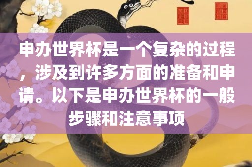 申办世界杯是一个复杂的过程,涉及到许多方面的准备和申请。以下是申办世界杯的一般步骤和注意事项