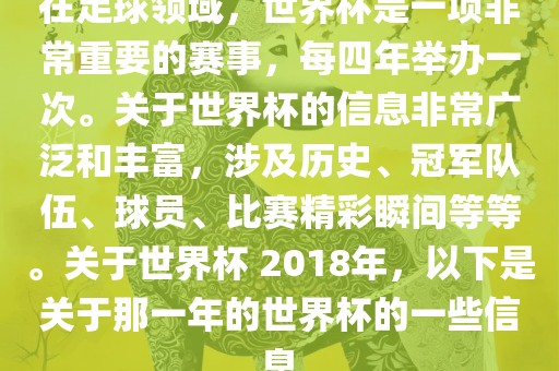 在足球领域,世界杯是一项非常重要的赛事,每四年举办一次。关于世界杯的信息非常广泛和丰富,涉及历史、冠军队伍、球员、比赛精彩瞬间等等。关于世界杯 2018年,以下是关于那一年的世界杯的一些信息