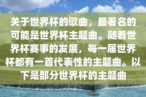 关于世界杯的歌曲,最著名的可能是世界杯主题曲。随着世界杯赛事的发展,每一届世界杯都有一首代表性的主题曲。以下是部分世界杯的主题曲