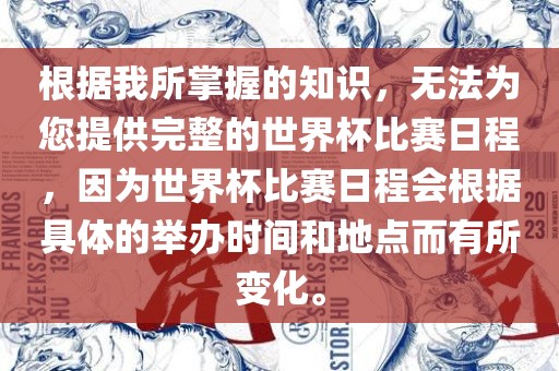 建议您通过官方渠道或相关新闻获取最新的世界杯比赛日程,您可以关注国际足联(FIFA)的官方网站、社交媒体账号或相关体育新闻网站,以获取最准确和最新的世界杯比赛日程信息。