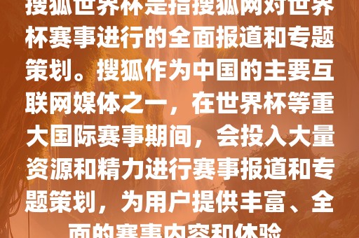 搜狐世界杯是指搜狐网对世界杯赛事进行的全面报道和专题策划。搜狐作为中国的主要互联网媒体之一,在世界杯等重大国际赛事期间,会投入大量资源和精力进行赛事报道和专题策划,为用户提供丰富、全面的赛事内容和体验。