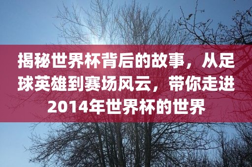 摘要:本文将带你走进2014年世界杯的世界,揭示背后不为人知的故事。从足球英雄到赛场风云,感受赛场上的激情与荣耀。一起领略世界杯的魅力,体验足球带来的激情与热血。跟随本文,你将深入了解世界杯背后的故事,感受足球的力量和荣耀。