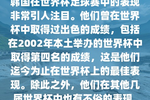 韩国在世界杯足球赛中的表现非常引人注目。他们曾在世界杯中取得过出色的成绩,包括在2002年本土举办的世界杯中取得第四名的成绩,这是他们迄今为止在世界杯上的最佳表现。除此之外,他们在其他几届世界杯中也有不俗的表现。