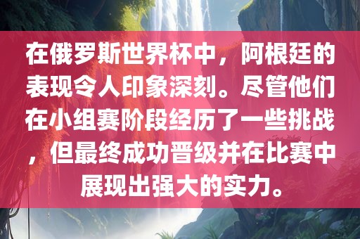 在俄罗斯世界杯中,阿根廷的表现令人印象深刻。尽管他们在小组赛阶段经历了一些挑战,但最终成功晋级并在比赛中展现出强大的实力。