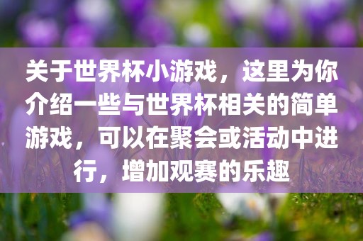 关于世界杯小游戏,这里为你介绍一些与世界杯相关的简单游戏,可以在聚会或活动中进行,增加观赛的乐趣
