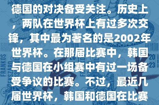 韩国与德国在世界杯足球比赛中的对决备受瞩目。历史上两队的交锋充满话题,尤其是2002年世界杯的小组赛。近年来两队在比赛中的表现趋于正常。尽管争议仍然存在,但足球比赛的结果取决于场上球员的表现和战术的运用。期待未来两队能展现出更加精彩的比赛。