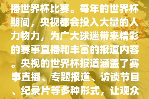 央视作为世界杯赛事的重要转播媒体,每年世界杯期间都会投入大量资源,为广大球迷带来精彩的赛事直播和丰富的报道。报道形式包括赛事直播、专题报道、访谈节目和纪录片等,让观众全面了解世界杯背后的故事和瞬间。