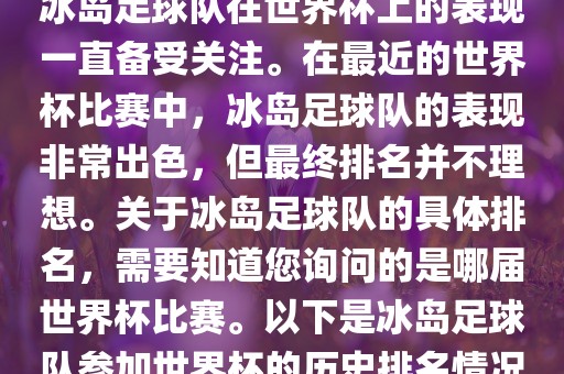 冰岛足球队在世界杯上的表现引人关注。尽管在最近的世界杯比赛中表现出色,但最终排名并不理想。关于其历史排名,需知道具体是哪届世界杯比赛。冰岛足球队在世界杯赛场上留下了深刻的足迹。