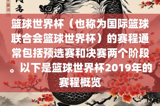 篮球世界杯(也称为国际篮球联合会篮球世界杯)的赛程通常包括预选赛和决赛两个阶段。以下是篮球世界杯2019年的赛程概览