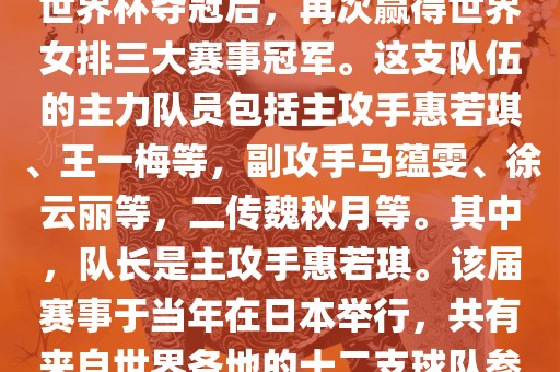 在2011年日本女排世界杯赛中,中国女排以全胜战绩摘得冠军,这也是中国女排继1995年世界杯夺冠后,再次赢得世界女排三大赛事冠军。这支队伍的主力队员包括主攻手惠若琪、王一梅等,副攻手马蕴雯、徐云丽等,二传魏秋月等。其中,队长是主攻手惠若琪。该届赛事于当年在日本举行,共有来自世界各地的十二支球队参与角逐。此外,该届世界杯的最佳发球奖由日本名将木村纱织获得。