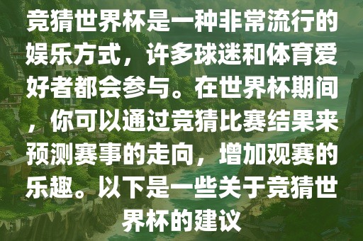 竞猜世界杯是一种非常流行的娱乐方式,许多球迷和体育爱好者都会参与。在世界杯期间,你可以通过竞猜比赛结果来预测赛事的走向,增加观赛的乐趣。以下是一些关于竞猜世界杯的建议