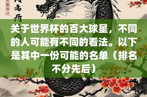 • 转载请注明来自洛阳市法福文化传播有限公司,本文标题:《关于世界杯的百大球星,不同的人可能有不同的看法。以下是其中一份可能的名单(排名不分先后)》
