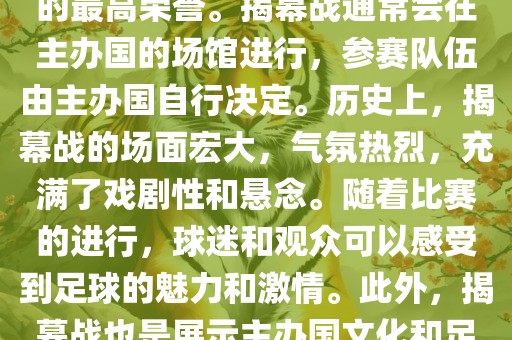 世界杯揭幕战是世界杯足球赛的开幕式比赛,具有重大象征意义,代表全球足球最高荣誉。比赛通常在主办国的场馆进行,场面宏大、气氛热烈。揭幕战是每届世界杯的重要组成部分,展示主办国的文化和足球风格,让球迷和观众感受到足球的魅力和激情。