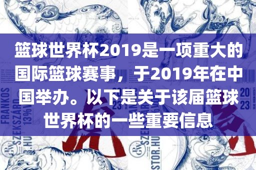 篮球世界杯2019是一项重大的国际篮球赛事,于2019年在中国举办。以下是关于该届篮球世界杯的一些重要信息