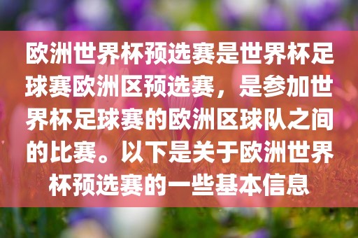 欧洲世界杯预选赛是参加世界杯足球赛的欧洲区球队之间的比赛,对于参加世界杯的欧洲足球队来说具有重要意义,通过预选赛,各队可以锻炼实力、积累经验,为参加世界杯做好准备。