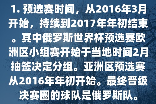 1. 预选赛时间,从2016年3月开始,持续到2017年年初结束。其中俄罗斯世界杯预选赛欧洲区小组赛开始于当地时间2月抽签决定分组。亚洲区预选赛从2016年年初开始。最终晋级决赛圈的球队是俄罗斯队。