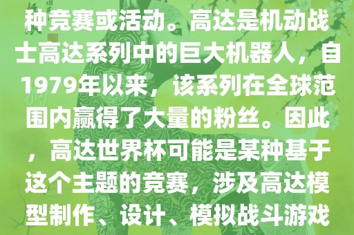 为了获取关于“高达世界杯”更具体的信息,您可以尝试在社交媒体平台上搜索相关话题,或者查看与高达相关的官方网站和论坛,不过截至当前时间,我并没有具体关于“高达世界杯”的详细信息,如果您想了解具体的活动情况,建议访问相关社区获取最新和详细的信息。