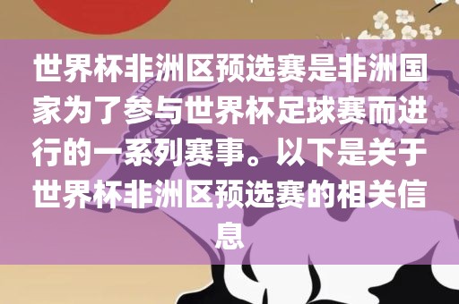 世界杯非洲区预选赛是非洲国家为了参与世界杯足球赛而进行的一系列赛事。以下是关于世界杯非洲区预选赛的相关信息