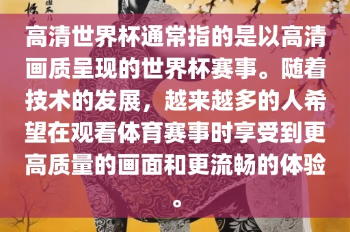 高清世界杯通常指的是以高清画质呈现的世界杯赛事。随着技术的发展,越来越多的人希望在观看体育赛事时享受到更高质量的画面和更流畅的体验。
