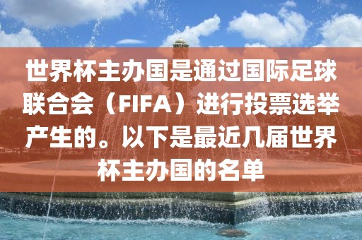 世界杯主办国是通过国际足球联合会(FIFA)进行投票选举产生的。以下是最近几届世界杯主办国的名单