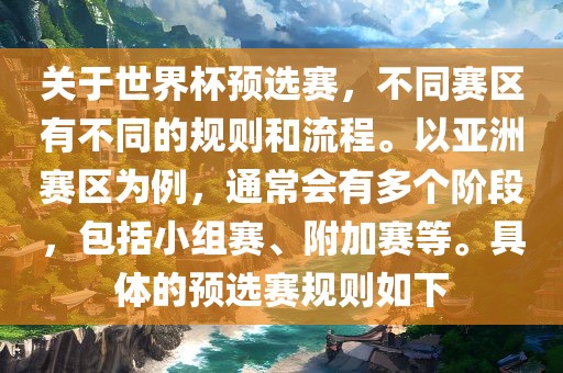 关于世界杯预选赛,不同赛区有不同的规则和流程。以亚洲赛区为例,通常会有多个阶段,包括小组赛、附加赛等。具体的预选赛规则如下