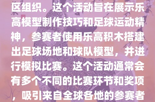 具体的活动安排和规则可能会因组织者和年份而异,建议关注相关社区或官方渠道以获取最新信息,乐高公司本身也可能推出与足球或世界杯相关的乐高套装或模型,供爱好者们收藏和展示。