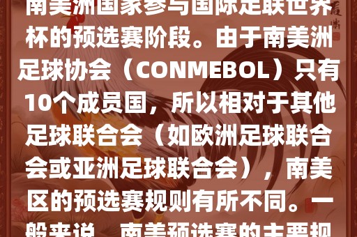 世界杯南美预选赛通常指的是南美洲国家参与国际足联世界杯的预选赛阶段。由于南美洲足球协会(CONMEBOL)只有10个成员国,所以相对于其他足球联合会(如欧洲足球联合会或亚洲足球联合会),南美区的预选赛规则有所不同。一般来说,南美预选赛的主要规则如下