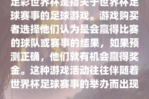 摘要:足彩世界杯是一种基于世界杯足球赛事的足球游戏,玩家通过预测比赛结果来参与游戏,有机会赢得奖金。这种游戏活动通常伴随着世界杯足球赛事的举办而出现,玩家可以选择他们认为会获胜的球队或赛事结果。
