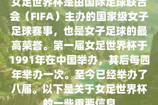 女足世界杯是由国际足球联合会(FIFA)主办的国家级女子足球赛事,也是女子足球的最高荣誉。第一届女足世界杯于1991年在中国举办,其后每四年举办一次。至今已经举办了八届。以下是关于女足世界杯的一些重要信息
