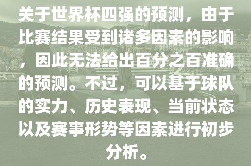 关于世界杯四强的预测,由于比赛结果受到诸多因素的影响,因此无法给出百分之百准确的预测。不过,可以基于球队的实力、历史表现、当前状态以及赛事形势等因素进行初步分析。