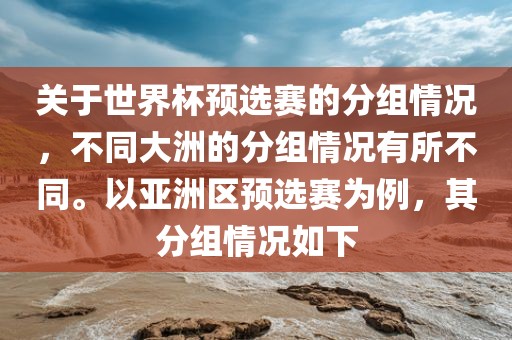 关于世界杯预选赛的分组情况,不同大洲的分组情况有所不同。以亚洲区预选赛为例,其分组情况如下