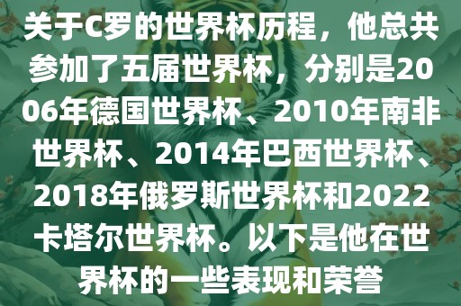 关于C罗的世界杯历程,他总共参加了五届世界杯,分别是2006年德国世界杯、2010年南非世界杯、2014年巴西世界杯、2018年俄罗斯世界杯和2022卡塔尔世界杯。以下是他在世界杯的一些表现和荣誉