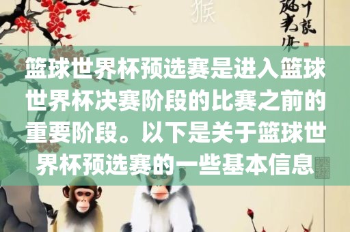 篮球世界杯预选赛是进入篮球世界杯决赛阶段的比赛之前的重要阶段。以下是关于篮球世界杯预选赛的一些基本信息
