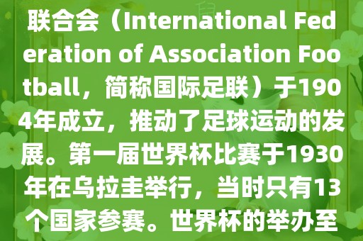世界杯源自19世纪末的瑞士,随着足球运动的普及,国际足联于1904年成立。第一届世界杯比赛于1930年在乌拉圭举办,仅有13个国家参赛。世界杯历史已近百年,期间国际足联不断推动足球运动发展,并见证了许多重要里程碑和事件。