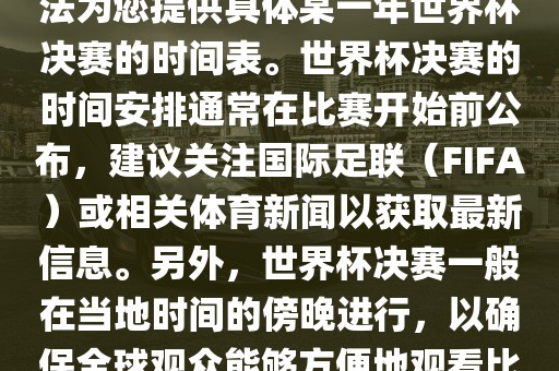 摘要:本文指出无法提供具体某一年世界杯决赛的时间表,建议读者关注国际足联或相关体育新闻以获取最新信息。世界杯决赛通常在当地时间的傍晚进行,以确保全球观众能够方便地观看比赛。具体决赛时间安排在比赛开始前公布。