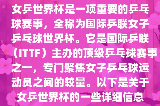女乒世界杯是一项重要的乒乓球赛事,全称为国际乒联女子乒乓球世界杯。它是国际乒联(ITTF)主办的顶级乒乓球赛事之一,专门聚焦女子乒乓球运动员之间的较量。以下是关于女乒世界杯的一些详细信息