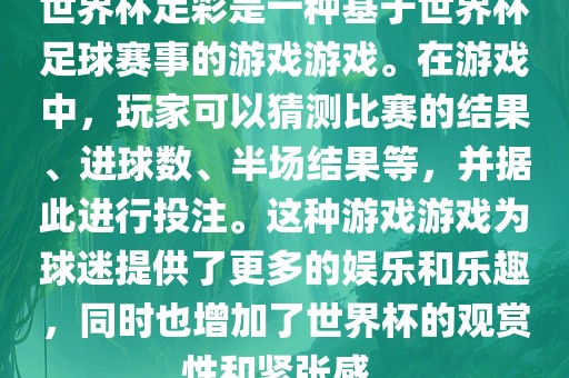 世界杯足彩是一种基于世界杯足球赛事的游戏游戏。在游戏中,玩家可以猜测比赛的结果、进球数、半场结果等,并据此进行投注。这种游戏游戏为球迷提供了更多的娱乐和乐趣,同时也增加了世界杯的观赏性和紧张感。
