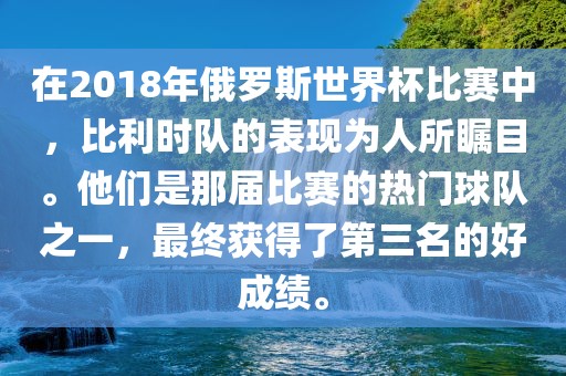 比利时队在2018年世界杯上的表现令人印象深刻,他们的团队精神和实力都展现得淋漓尽致,赢得了球迷们的喜爱和尊重,即使未能夺冠,但他们仍然成为了那届比赛上最出色的球队之一。