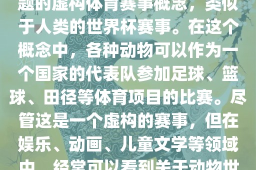 动物世界杯是一个以动物为主题的虚构体育赛事概念,类似于人类的世界杯赛事。在这个概念中,各种动物可以作为一个国家的代表队参加足球、篮球、田径等体育项目的比赛。尽管这是一个虚构的赛事,但在娱乐、动画、儿童文学等领域中,经常可以看到关于动物世界杯的故事和情节。