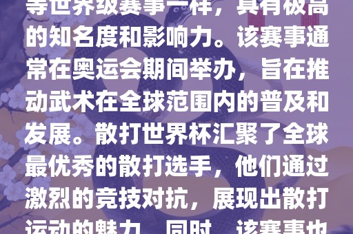 散打世界杯是世界武术散打最高水平的赛事之一,与奥运会同期举办,旨在推动武术的全球普及和发展。该赛事汇聚全球顶尖选手,展现散打运动的魅力,并促进不同国家和地区之间的文化交流。通过激烈的竞技对抗,选手们展现出散打的技巧、力量和美感。