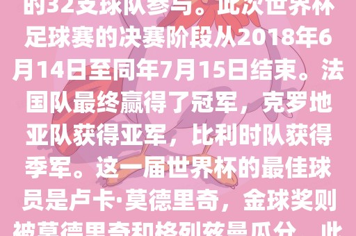 摘要:2018年俄罗斯世界杯是第21届足球赛事,全球32支球队参与。法国队赢得冠军,克罗地亚和比利时分别获得亚军和季军。最佳球员为卢卡·莫德里奇,金球奖被莫德里奇和格列兹曼分享。该届世界杯创造了多项纪录和亮点,观众人数创新高。