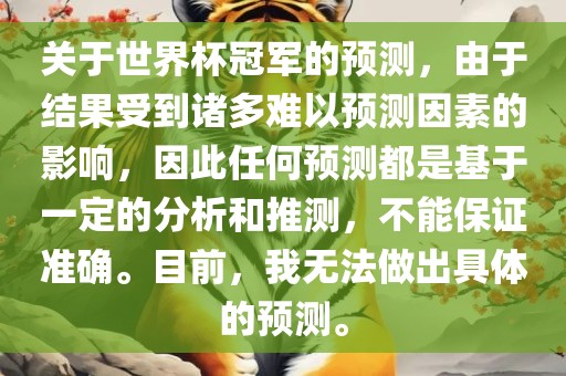 关于世界杯冠军的预测,由于结果受到诸多难以预测因素的影响,因此任何预测都是基于一定的分析和推测,不能保证准确。目前,我无法做出具体的预测。