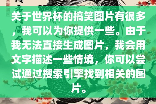 关于世界杯的搞笑图片有很多,我可以为你提供一些。由于我无法直接生成图片,我会用文字描述一些情境,你可以尝试通过搜索引擎找到相关的图片。