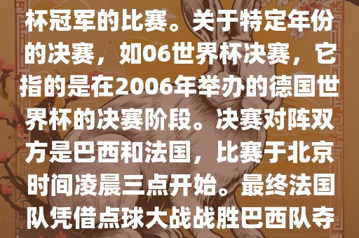 在世界杯历史上,决赛一般指的是小组赛后的最后一场比赛,决定哪支队伍能够赢得世界杯冠军的比赛。关于特定年份的决赛,如06世界杯决赛,它指的是在2006年举办的德国世界杯的决赛阶段。决赛对阵双方是巴西和法国,比赛于北京时间凌晨三点开始。最终法国队凭借点球大战战胜巴西队夺得冠军。如需更多信息,可以关注FIFA官网发布的世界杯决赛相关内容。