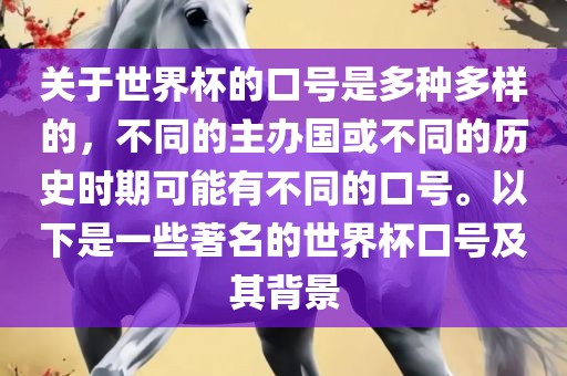 除此之外,每一届世界杯也都有自己的独特口号,旨在表达主办国对足球的热情和对世界杯的期待,这些口号不仅代表了世界杯的精神和文化内涵,也成为了世界杯历史的重要组成部分,如果您对某一届世界杯的口号有更具体的问题,欢迎继续向我提问。